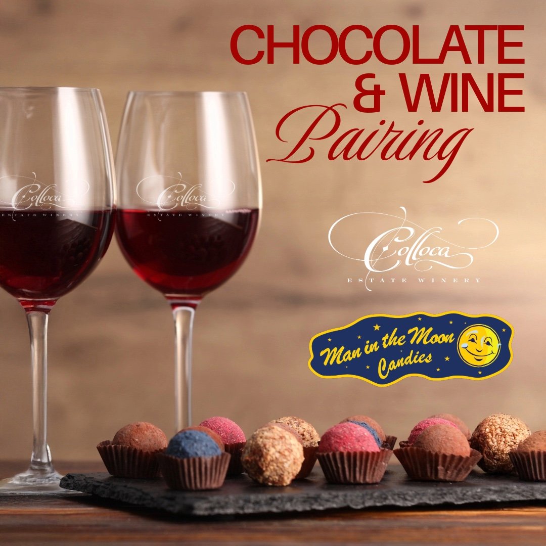Hosted with local Oswego candy makers, Man in the Moon Candies, enjoy a tasting event melting in decadence! You’ll be presented with six exquisite pairings of award-winning wines and handmade chocolates to savor in our unique setting— The Tasting Room on The Lake Effect Vineyard at Colloca Estate Winery.